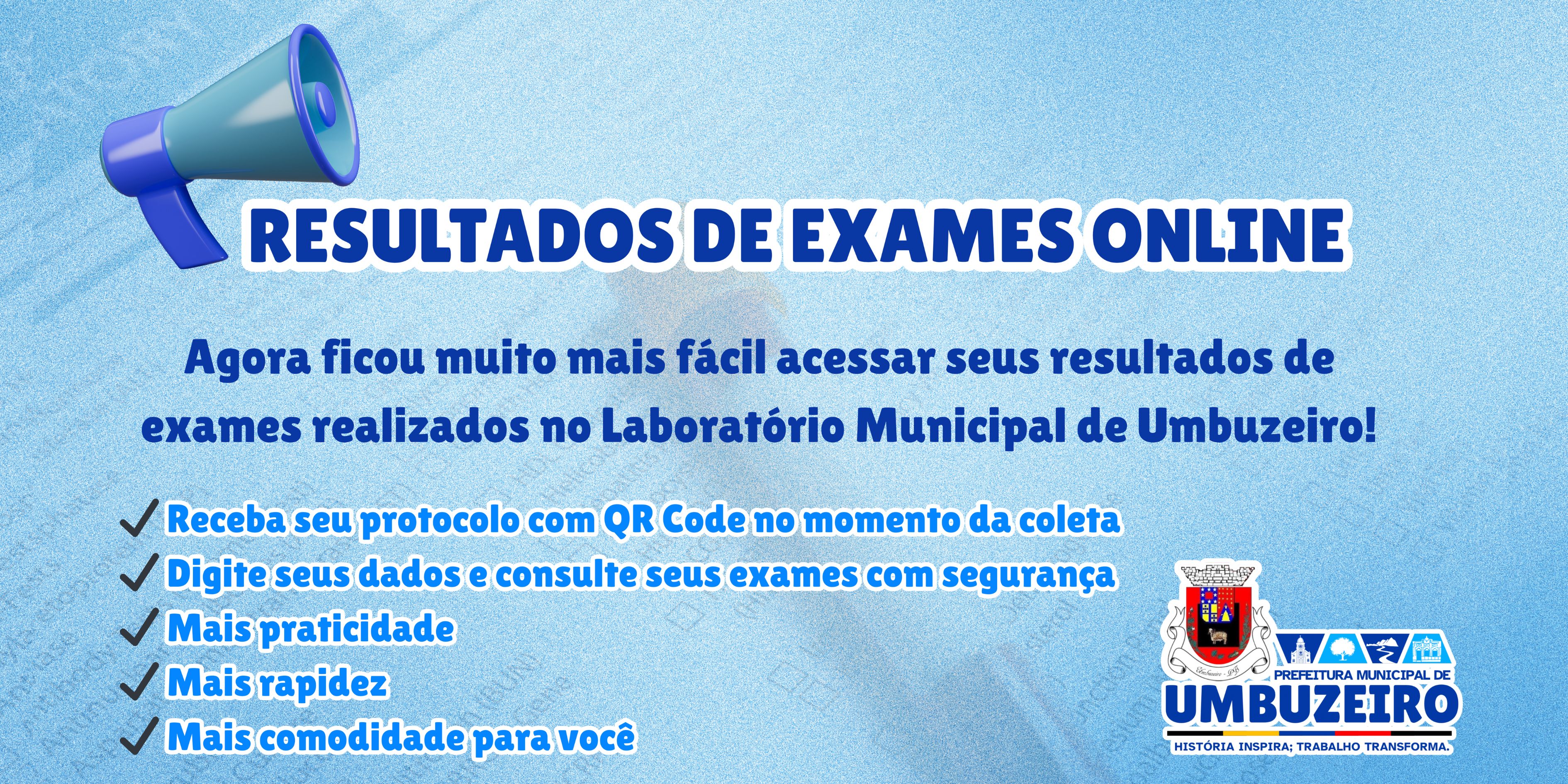 URL https://www.labnet.com.br/umbuzeiro/acesso_paciente.php Imagem Desktop Informe uma imagem para ser visualizada no desktop. Recomendado utilização uma imagem na proporcão de 3:1. Ex 1280x590px. Descrição para Desktop Caso preenchido, este valor será visualizado na versão desktop do Carrossel. Agora ficou muito mais fácil acessar os resultados dos exames realizados no Laboratório Municipal de Umbuzeiro! Imagem Tablet Informe uma imagem para ser visualizada no Tablet. Recomendado utilização uma imagem na proporcão de 16:9. Ex 1280x720px Utilizar Título e Descrição do Desktop para Tablet sim Título para Tablet Caso preenchido, este valor será visualizado na versão tablet do Carrossel. Descrição para Tablet Caso preenchido, este valor será visualizado na versão tablet do Carrossel. Imagem Celular Informe uma imagem para ser visualizada no celular. Recomendado utilização uma imagem na proporcão de 4:3. Ex 800x600px. Utilizar Título e Descrição do Desktop para Celular sim Título para Celular Caso preenchido, este valor será visualizado na versão celular do Carrossel. Descrição para Celular Caso preenchido, este valor será visualizado na versão celular do Carrossel. Configurações Nome curto Esse nome será exibido na URL. 1f4e2-resultados-de-exames-online